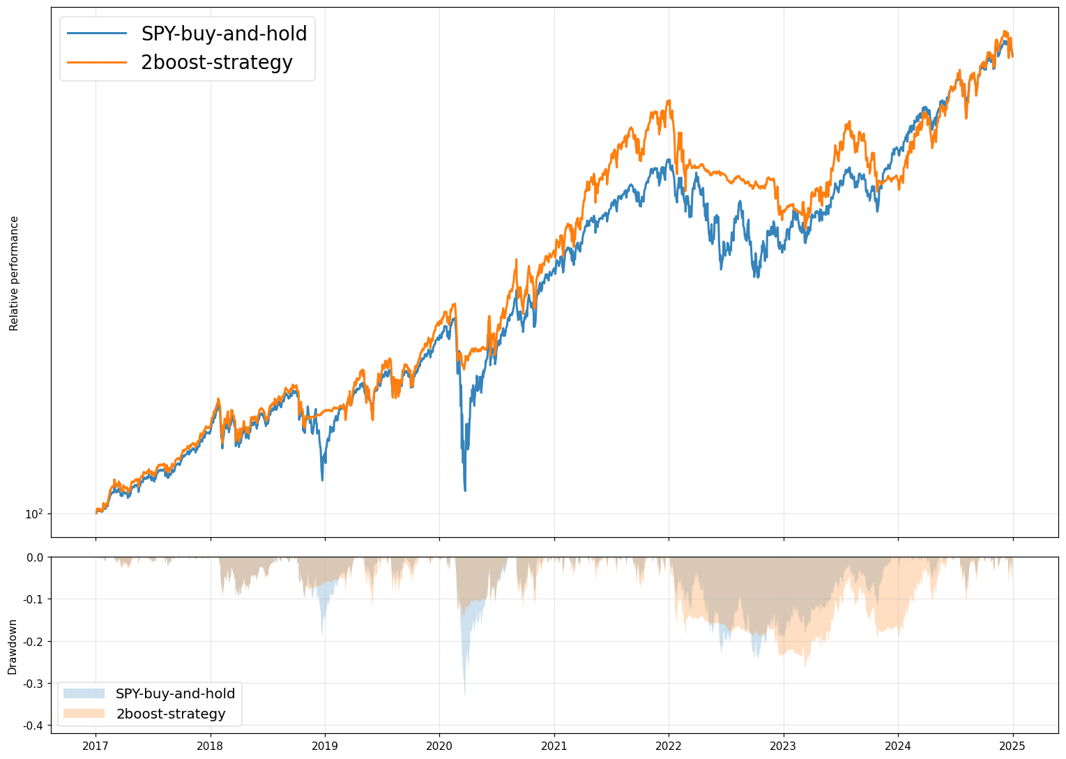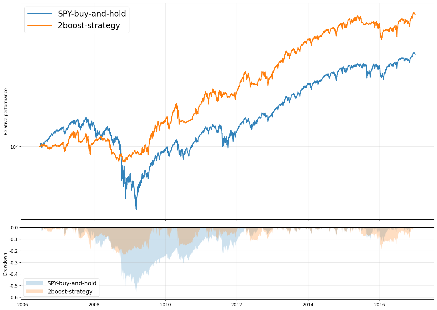 Figure 1: Relative performance of the 2boost strategy versus a SPY buy-and-hold benchmark.